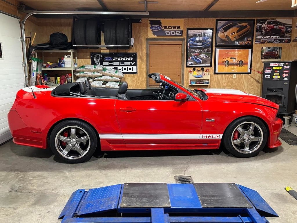 2012 Ford Mustang Shelby GT350 Convertible powered by a 5.0L V8 with upgraded 624 HP supercharger and 6-speed manual transmission, showing only 5,100 miles. Finished in Race Red with white racing stripes and charcoal black leather interior. Equipped with Wilwood rear brakes, Eibach suspension, 19" Cragar wheels, Borla center-exit exhaust, upgraded audio system, and power soft top. Rare, well-maintained performance convertible in excellent condition.