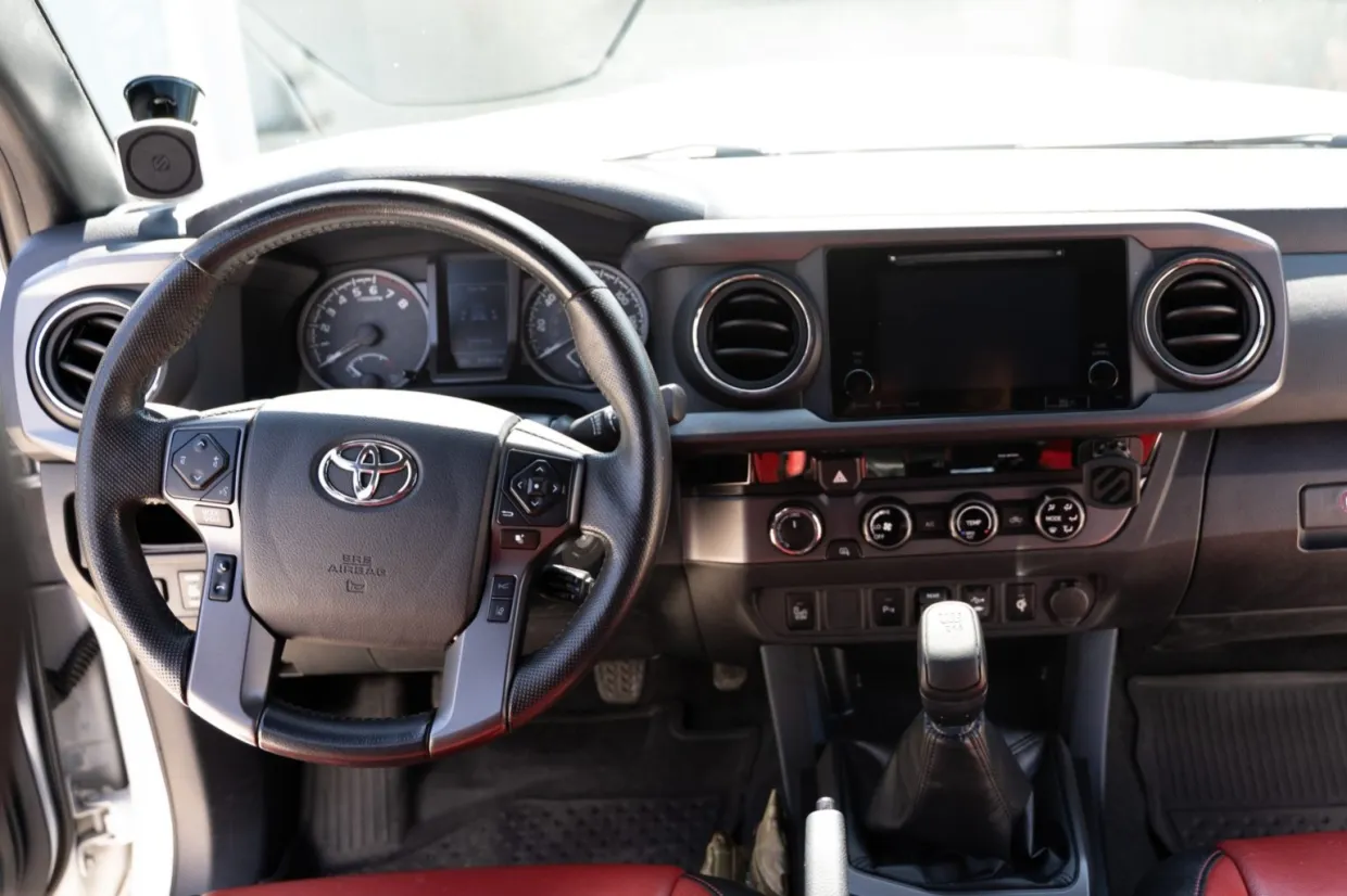 The Toyota Tacoma TRD Sport 4x4 Double Cab is a modified midsize pickup finished in Super White with black and red interior accents. Powered by a 3.5L V6 paired with a 6-speed manual and 4WD, it features a 3? lift kit, aftermarket wheels, limited-slip differential, and upgraded JL Audio sound system. Equipped with practical add-ons like a tonneau cover, bedliner, and side steps, this Florida-owned truck shows 84k miles and minor past damage on record.