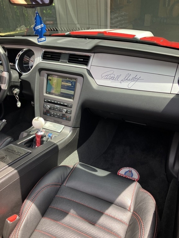 2012 Ford Mustang Shelby GT350 Convertible powered by a 5.0L V8 with upgraded 624 HP supercharger and 6-speed manual transmission, showing only 5,100 miles. Finished in Race Red with white racing stripes and charcoal black leather interior. Equipped with Wilwood rear brakes, Eibach suspension, 19" Cragar wheels, Borla center-exit exhaust, upgraded audio system, and power soft top. Rare, well-maintained performance convertible in excellent condition.